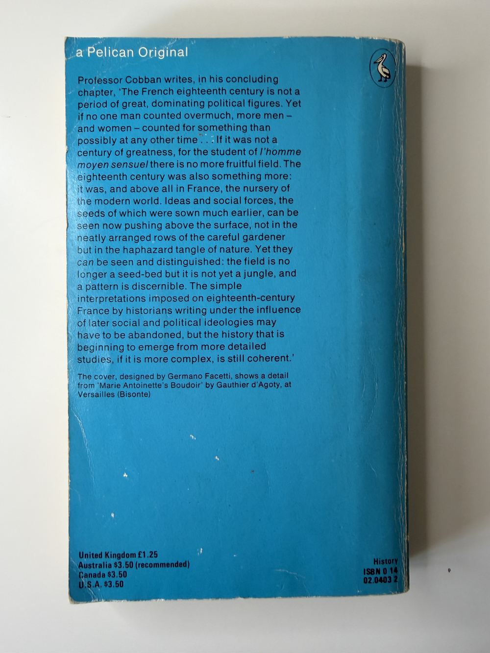 Professor Cobban writes, in his concluding chapter, The French eighteenth century is not a period of great, dominating political figures. Yet if no one man counted overmuch, more men – and women – counted for something than possibly at any other time..:If it was not a century of greatness, for the student of /’homme moyen sensuel there is no more fruitful field. The eighteenth century was also something more: it was, and above all in France, the nursery of the modern world. Ideas and social forces, the seeds of which were sown much earlier, can be seen now pushing above the surface, not in the neatly arranged rows of the careful gardener but in the haphazard tangle of nature. Yet they can be seen and distinguished: the field is no longer a seed-bed but it is not yet a jungle, and a pattern is discernible. The simple interpretations imposed on eighteenth-century France by historians writing under the influence of later social and political ideologies may have to be abandoned, but the history that is beginning to emerge from more detailed studies, if it is more complex, is still coherent.’