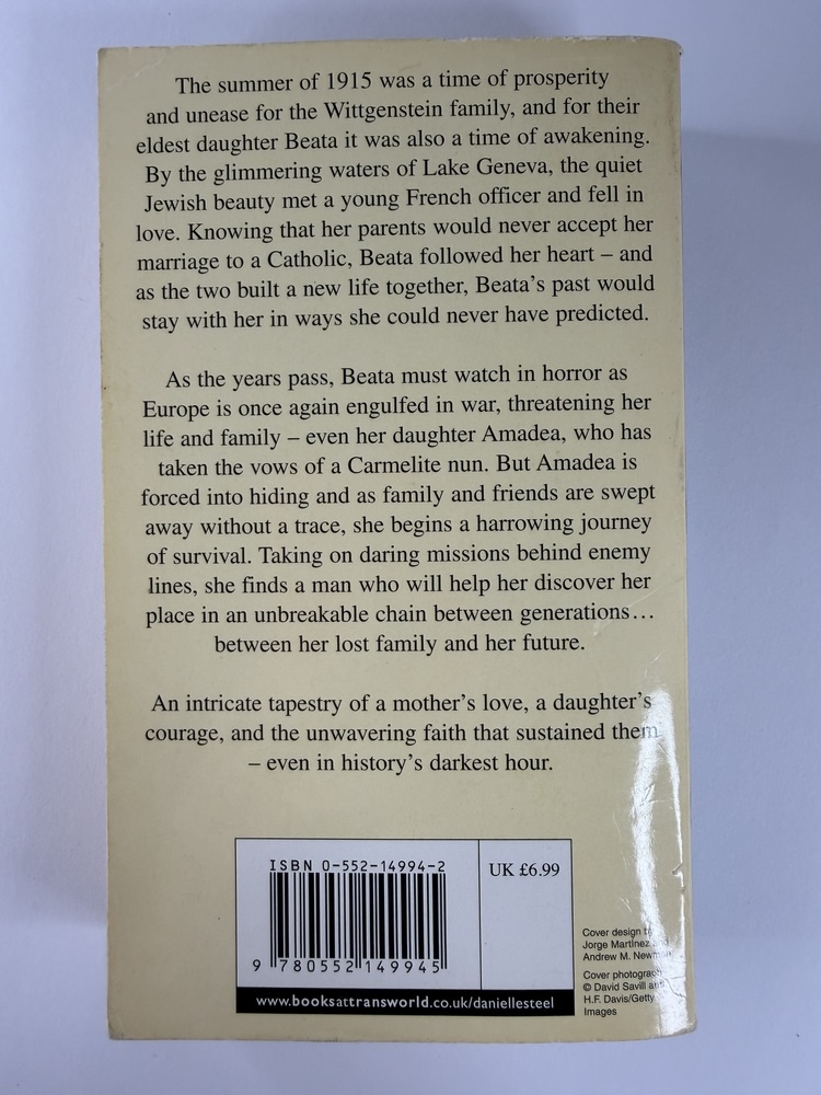 As the years pass, Beata must watch in horror as Europe is once again engulfed in war, threatening her life and family – even her daughter Amadea, who has taken the vows of a Carmelite nun. But Amadea is forced into hiding and as family and friends are swept away without a trace, she begins a harrowing journey of survival. Taking on daring missions behind enemy lines, she finds a man who will help her discover her place in an unbreakable chain between generations… between her lost family and her future.