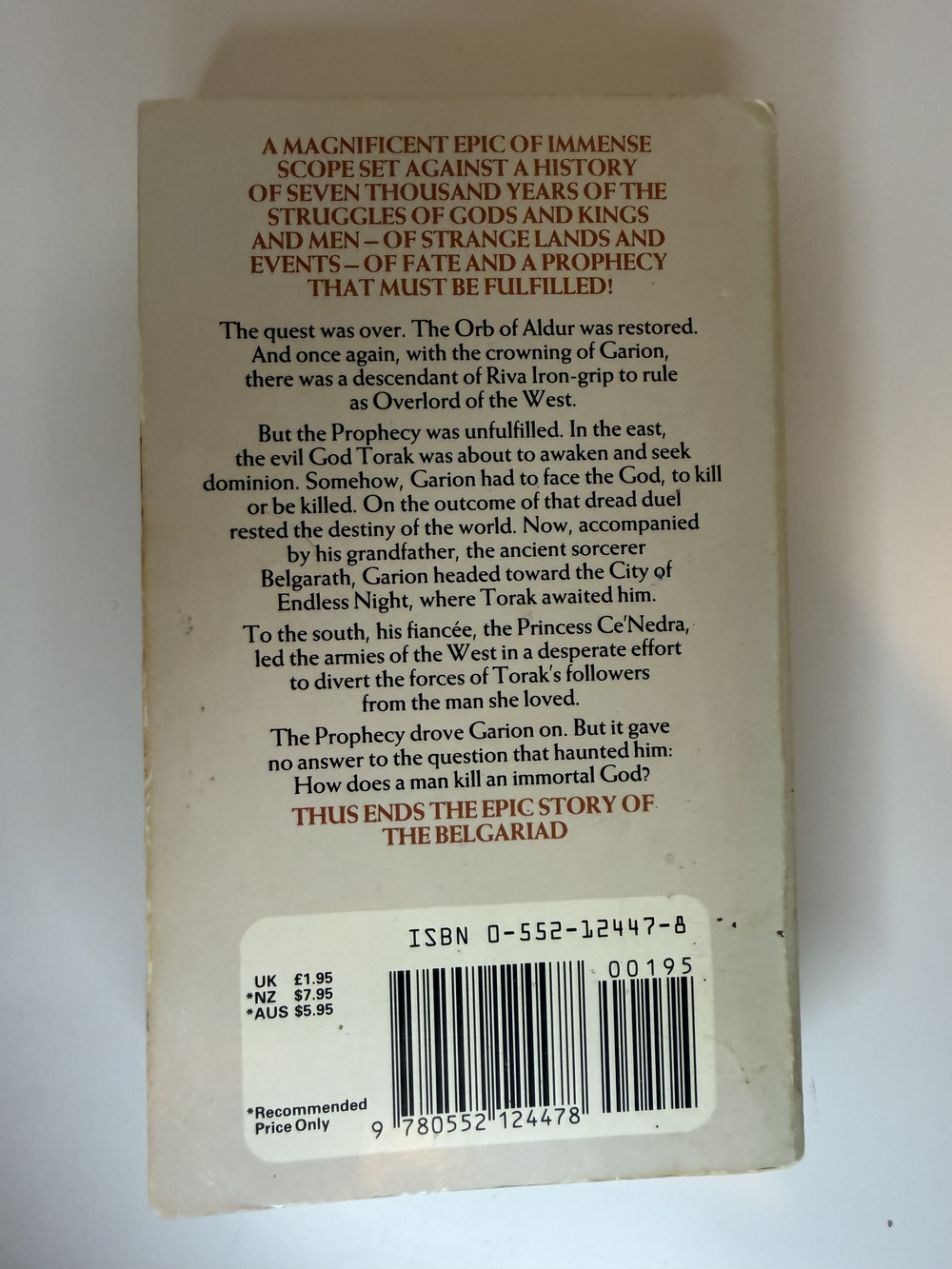 But the Prophecy was unfulfilled. In the east, the evil God Torak was about to awaken and seek dominion. Somehow, Garion had to face the God, to kill or be killed. On the outcome of that dread duel rested the destiny of the world. Now, accompanied by his grandfather, the ancient sorcerer Belgarath, Garion headed towards the City of Endless Night, where Torak awaited him.