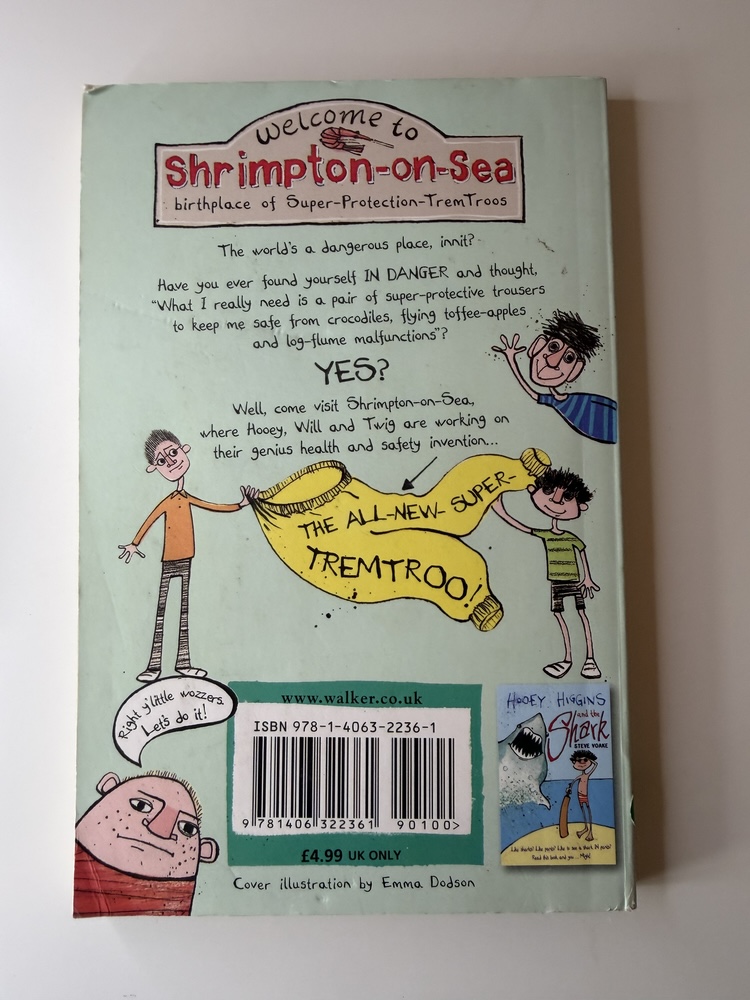 Have you ever found yourself in danger & thought, what I really need is a pair of super-protective trousers to keep me safe from crocodiles, flying toffee-apples & log-flume malfunctions? Yes? Well, come visit Shrimpton-on-Sea, where Hooey, Will & Twig are working on their genius health and safety invention – the all-new-super-TremTroo!