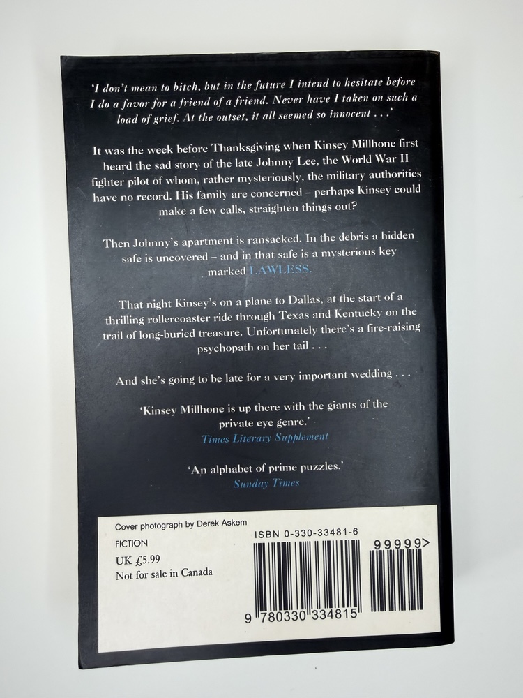 Then Johnny’s apartment is ransacked. In the debris a hidden safe is uncovered — and in that safe is a mysterious key marked LAWLESS. That night Kinsey’s on a plane to Dallas, at the start of a thrilling rollercoaster ride through Texas and Kentucky on the trail of long-buried treasure. Unfortunately there’s a fire-raising psychopath on her tail …