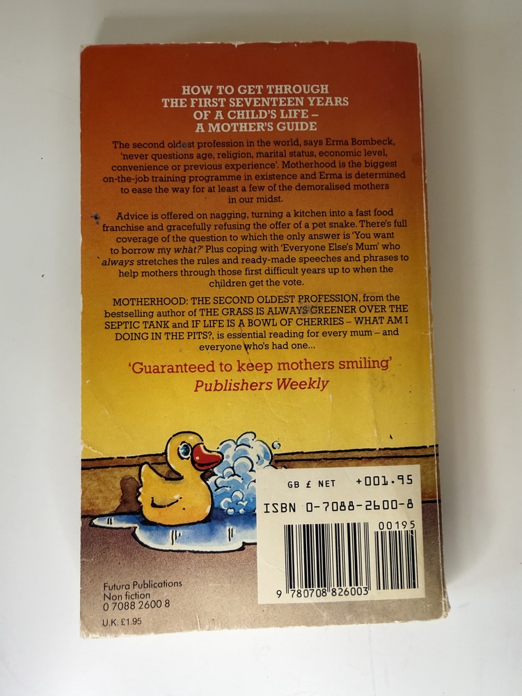 The second oldest profession in the world, says Erma Bombeck, ‘never questions age, religion, marital status, economic level, convenience or previous experience’. Motherhood is the biggest on-the-job training programme in existence and Erma is determined to ease the way for at least a few of the demoralised mothers in our midst.
