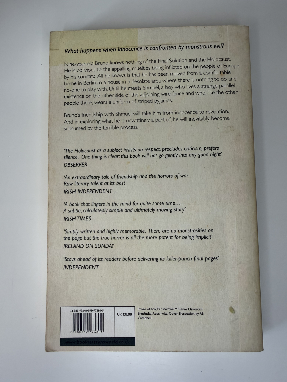 All he knows is that he has been moved from a comfortable home in Berlin to a house in a desolate area where there is nothing to do and no one to play with. Until he meets Shmuel, a boy who lives a strange parallel existence on the other side of the adjoining wire fence and who, like the other people there, wears a uniform of striped pyjamas.