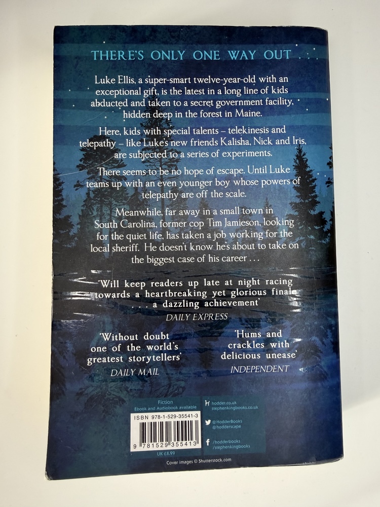 Luke Ellis, a super-smart twelve-year-old with an exceptional gift, is the latest in a long line of kids abducted and taken to a secret government facility, hidden deep in the forest in Maine.