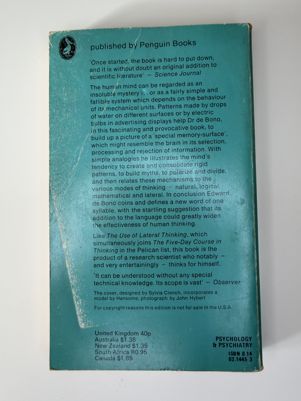 The human mind can be regarded as an insoluble mystery. or as a fairly simple and fallible system which depends on the behaviour of its mechanical units. Patterns made by drops of water on different surfaces or by electric bulbs in advertising displays help Dr de Bono, in this fascinating and provocative book, to build up a picture of a ‘special memory-surface’, which might resemble the brain in its selection, processing and rejection of information. With simple analogies he illustrates the mind’s tendency to create and consolidate rigid patterns, to build myths, to polarize and divide, and then relates these mechanisms to the various modes of thinking – natural, logical, mathematical and lateral. In conclusion Edward de Bono coins and defines a new word of one syllable, with the startling suggestion that its addition to the language could greatly widen the effectiveness of human thinking