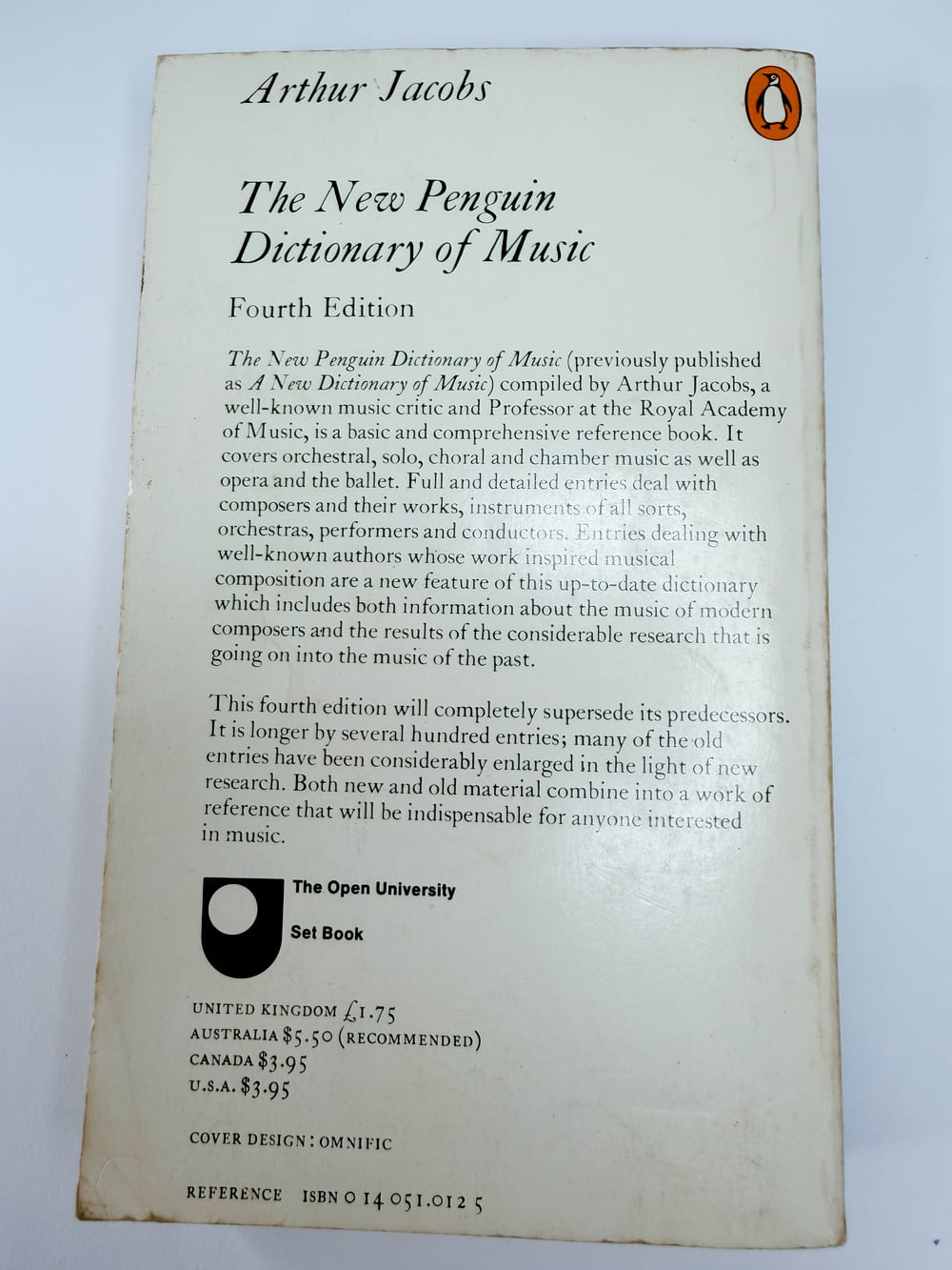 The New Penguin Dictionary of Music (previously published as A New Dictionary of Music) compiled by Arthur Jacobs, a well-known music critic and Professor at the Royal Academy of Music, is a basic and comprehensive reference book. It covers orchestral, solo, choral and chamber music as well as opera and the ballet. Full and detailed entries deal with composers and their works, instruments of all sorts, orchestras, performers and conductors. Entries dealing with well-known authors whose work inspired musical composition are a new feature of this up-to-date dictionary which includes both information about the music of modern composers and the results of the considerable research that is going on into the music of the past.
