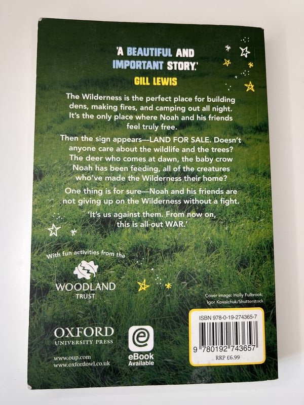 Then the sign appears-LAND FOR SALE. Doesn’t anyone care about the wildlife and the trees? The deer who comes at dawn, the baby crow Noah has been feeding, all of the creatures who’ve made the Wilderness their home? One thing is for sure-Noah and his friends are not giving up on the Wilderness without a fight.